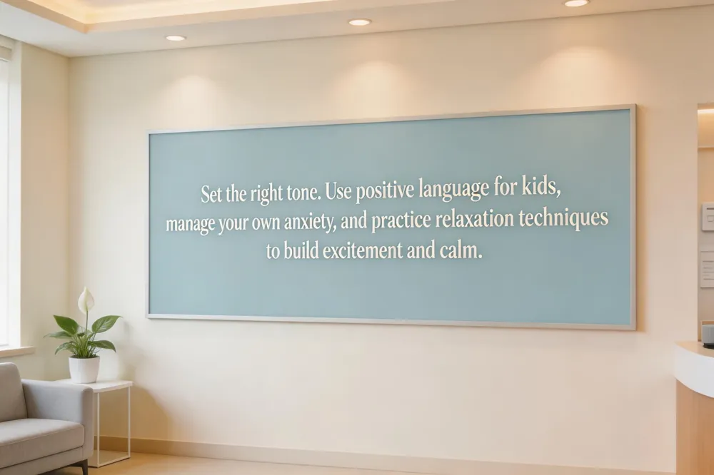 Stay in the exam room to offer comfort and moral support. Avoid using words that might cause fear, like 'pain' or 'drill.' Instead, let the dental professional guide the conversation using child-friendly language.