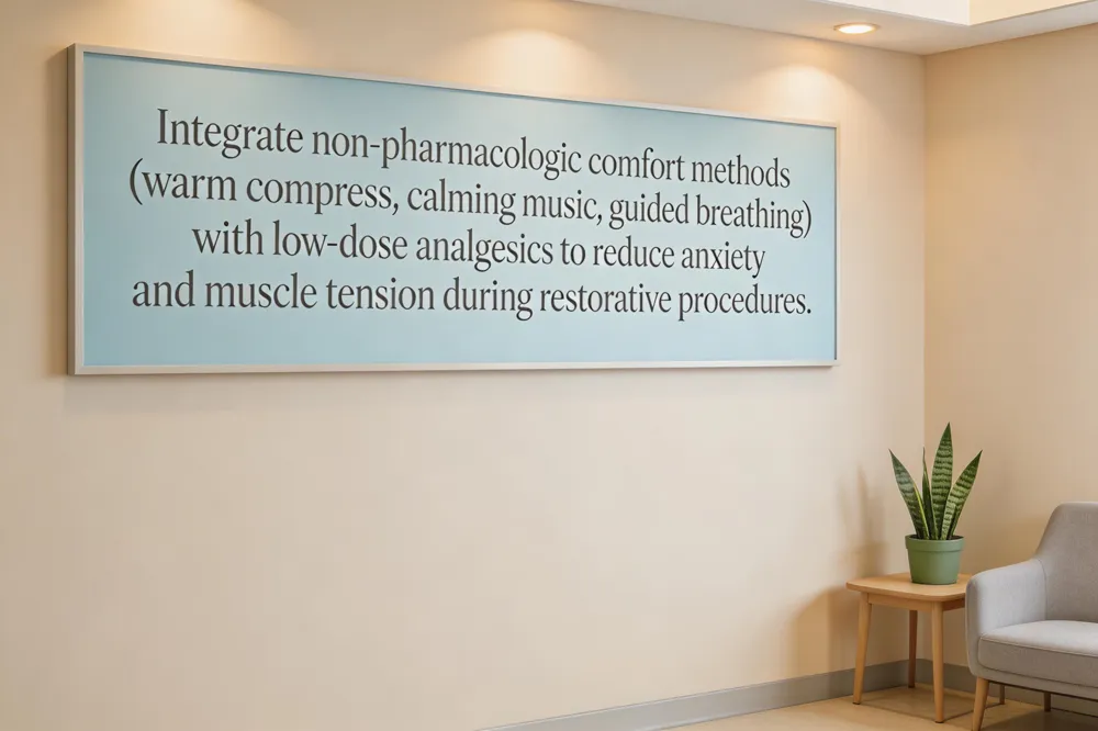Comfort‑focused treatment is a patient‑centered approach that blends gentle non‑pharmacologic methods (warm compresses, calming music, aromatherapy, guided breathing) with low‑dose analgesics only when needed. By easing pain, anxiety, and muscle tension, the dentist can work efficiently while patients—young and old—feel safe and relaxed in a modern, welcoming office.