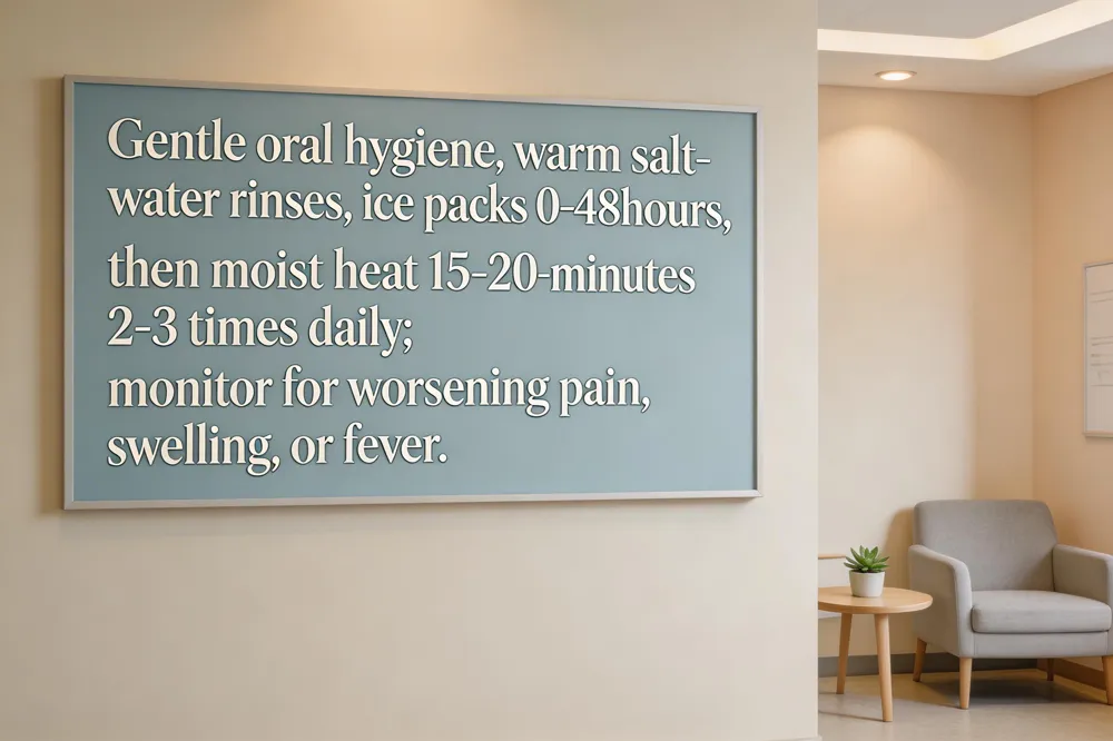 After any dental procedure, start with a gentle oral‑hygiene routine: brush with a soft brush, rinse with warm salt water 2‑3 times daily, and avoid vigorous flossing for the first 24 hours. Use ice packs for the first 24‑48 hours (10‑15 minutes on, 15‑minutes off) to control swelling. After 24‑48 hours, switch to Moist heat (warm, damp towel) or low‑setting heating pad for 15‑20 minutes, followed by a 20‑minute break; repeat 2‑3 times daily to relax jaw muscles and improve circulation. Seek professional help if pain or swelling worsens, if you develop fever, or if the clot seems displaced. Frequently asked questions cover safe temperatures, barrier use, and when to combine heat with NSAIDs—our caring team tailors guidance for patients of all ages, using modern, comfort‑first techniques.
