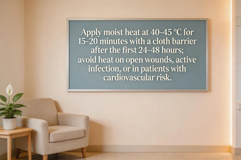 Safety guidelines – Apply moist heat (warm, damp towel or low‑setting heating pad) for 15‑20 minutes, then wait at least 20 minutes before the next session. Always place a thin cloth between skin and the heat source, keep the temperature between 40‑45 °C (104‑113 °F), and stop if you feel burning, redness, or discomfort.