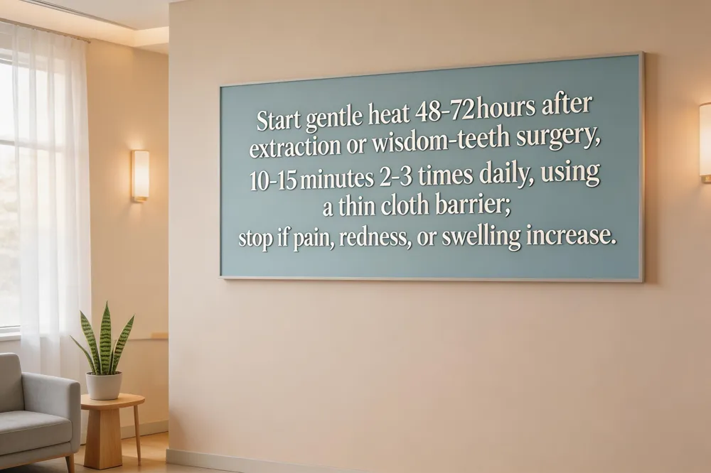 - When to use heat after wisdom teeth removal? Begin after 24‑48 hours, preferably 48‑72 hours, for 5‑7 minutes per side, 3 times daily.
