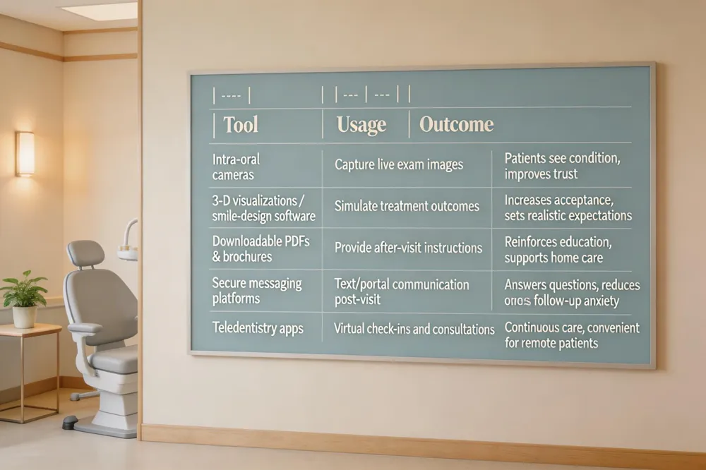 | Intra‑oral cameras, 3‑D visualizations, and downloadable PDFs let patients watch real‑time images of their teeth and see simulated treatment outcomes. This visual language builds trust, clarifies diagnoses, and raises treatment acceptance. Secure messaging platforms and teledentistry apps keep the conversation flowing after the chair‑side visit, allowing patients to ask follow‑up questions, receive home‑care instructions, and schedule virtual check‑ins without leaving home. The result is continuous, personalized care that improves oral‑health outcomes and patient satisfaction. |