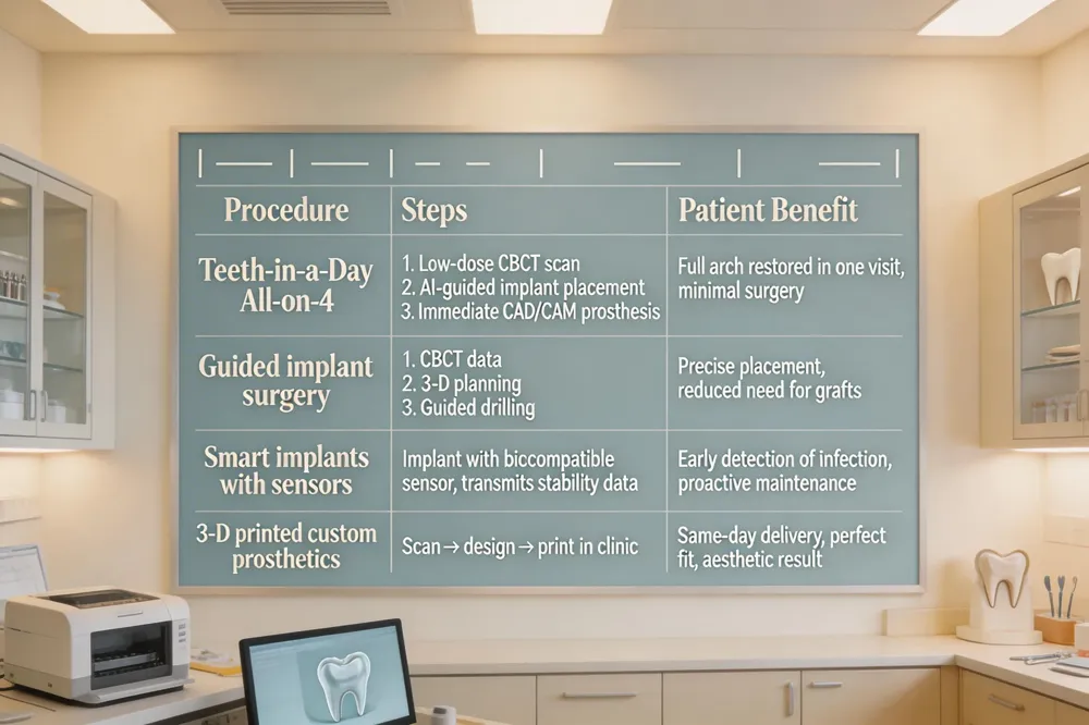 | Modern dental technology now lets patients replace an entire arch of missing teeth in a single visit with the Teeth‑in‑a‑Day All‑on‑4 protocol. Using only four strategically placed implants, the workflow begins with a low‑dose CBCT scan that creates a 3‑D map of bone, nerves and sinus anatomy. Computer‑guided surgery, powered by intra‑oral scanners and AI‑enhanced planning software, places the implants with sub‑millimetre accuracy, often eliminating the need for extensive bone grafts. Immediately after placement, a CAD/CAM mill or 3‑D printer fabricates a custom, tooth‑colored prosthetic that fits like natural dentition, allowing patients to walk out with a temporary full set of teeth the same day. Looking ahead, “smart” implants equipped with biocompatible sensors can monitor bone stability and detect early infection, sending real‑time data to the dentist for proactive care. Practices like Veenstra Family Dental in Midland Park, NJ, combine these cutting‑edge tools with a warm, family‑focused environment to deliver faster, more comfortable, and long‑lasting solutions for patients of all ages. |