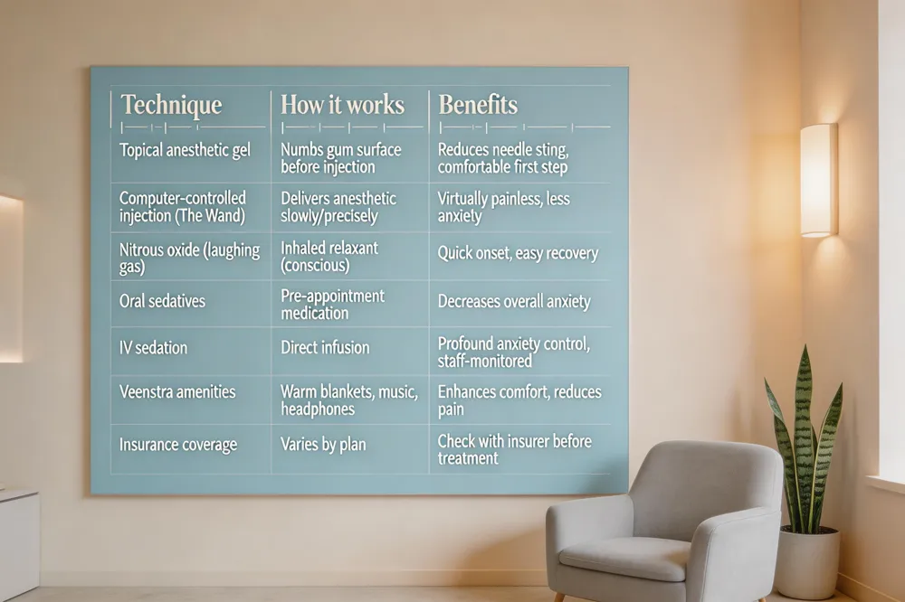Modern pain‑free dentistry combines gentle anesthesia, advanced delivery systems, and soothing amenities. First, a topical anesthetic gel numbs the gum surface before a local anesthetic injection, and computer‑controlled devices like The Wand deliver the medication slowly for a virtually painless sting. For anxious patients, nitrous oxide (laughing gas), oral sedatives, or IV sedation calm nerves while you stay conscious and comfortable. Veenstra Family Dental enhances the experience with warm blankets, music, and noise‑canceling headphones.