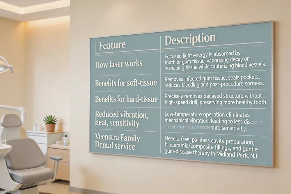 laser‑assisted fillings and gum‑disease therapy at Veenstra – At Veenstra Family Dental in Midland Park, NJ, we use lasers for painless cavity preparation, bioceramic or composite fillings, and gentle gum‑disease therapy. The result is a needle‑free, comfortable experience for patients of all ages, especially those with dental anxiety.