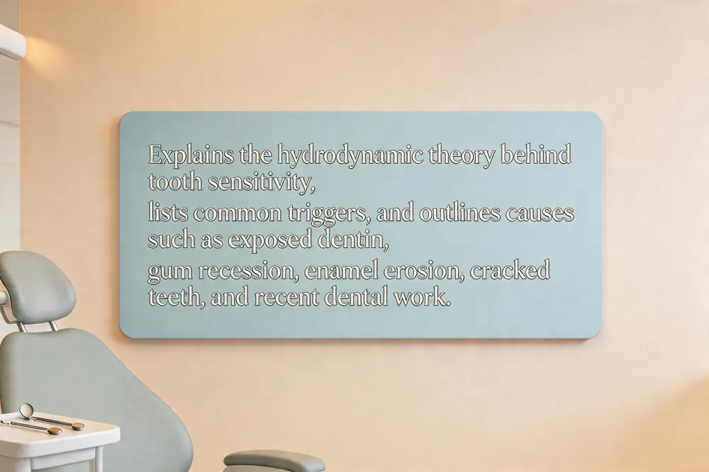 Tooth sensitivity is most often explained by the hydrodynamic theory: stimuli such as cold, heat, sweet, or acidic foods cause fluid movement within dentin tubules, which then triggers nerve endings and produces a sharp, brief pain. Common triggers include drinking iced water, biting into ice cream, sipping citrus juice, or using a hard‑bristled toothbrush. Underlying causes are usually exposed dentin—whether from gum recession, enamel erosion due to acidic foods or reflux, cracked or fractured teeth, aggressive brushing, or recent dental work like fillings, crowns, or whitening treatments.