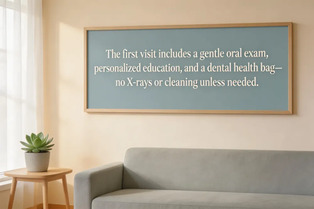 Walking into a pediatric practice, parents are greeted by a bright, play‑filled waiting area with toys, books and a friendly staff member who offers a quick tour. The child can explore a colorful treatment room before the appointment, which helps reduce anxiety. During the visit the dentist (or hygienist) positions the baby on the parent’s lap in a knee‑to‑knee stance, puts on protective sunglasses and performs a gentle oral exam—counting erupted teeth, checking gums, jaw alignment and any early signs of decay. No routine cleaning or X‑rays are done unless a specific concern arises. The clinician then provides hands‑on education: how to wipe gums, use a rice‑sized smear of fluoride toothpaste, proper brushing technique once teeth appear, and nutrition tips to limit sugary drinks. Parents receive a “dental health bag” with a tiny toothbrush, fluoride toothpaste and floss, plus written resources. This first visit establishes a dental home—a continuous, caring relationship that begins by age one, builds trust, and sets a positive tone for lifelong oral‑health care.
