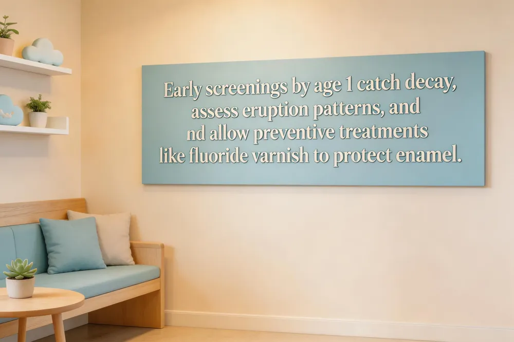 A pediatric dental screening is a quick, comprehensive examination performed by a dentist to assess a child’s oral health and catch problems early. The American Academy of Pediatric Dentistry recommends that the first screening occur by age one or within six months of the first tooth erupting, and then every six months thereafter. During the visit the dentist checks the gums, teeth, and jaw for early signs of decay, misaligned bites, gum inflammation, or developmental issues. Key components include a visual oral exam, gentle probing of the teeth, assessment of eruption patterns, and a discussion of the child’s diet and oral habits. Preventive treatments such as fluoride varnish, silver‑diamine fluoride, and sealants are often applied on the spot to strengthen enamel and arrest early lesions, dramatically lowering the risk of cavities. The screening also provides parents with personalized education on proper brushing techniques, appropriate toothpaste amounts, and habits like thumb‑sucking that can affect oral health. By establishing a dental home early, children become comfortable with the dental environment, reducing future anxiety and fostering lifelong healthy smiles.