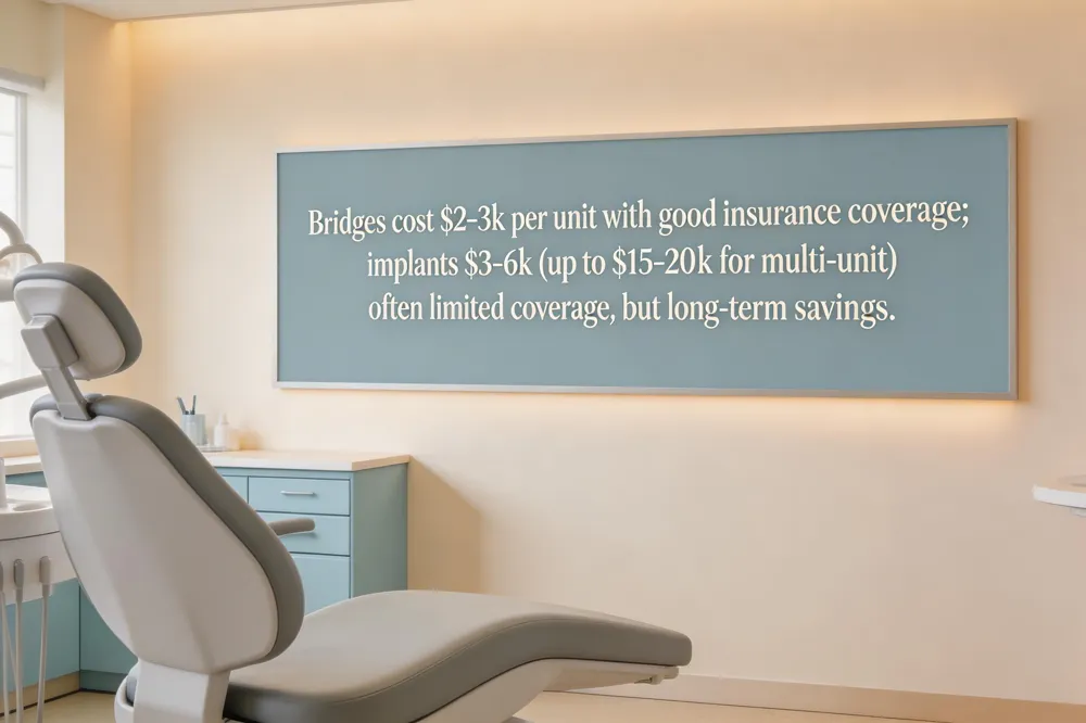 Up‑front price differences – A traditional three‑unit bridge usually costs $2,000‑$3,000 per unit, while a single‑tooth implant runs $3,000‑$6,000 (often $5,000‑$6,000 including the crown). Implant‑supported bridges are more expensive: a three‑tooth implant bridge is $9,000‑$15,000 and a four‑tooth version $12,000‑$20,000, because each titanium post and its components cost $3,000‑$5,000.