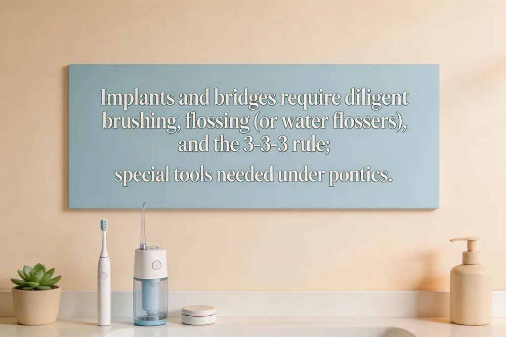 Keeping both implants and bridges clean is essential for long‑term success. For implants, brush twice daily with a soft‑bristled brush at a 45° angle to the gum line and floss once a day using thin‑ended floss or a water flosser to reach around the titanium post. Bridges require the same daily brushing, but because a pontic sits between two crowns, special tools—such as floss threaders, interdental brushes, or a water flosser—are needed to clean under the bridge and prevent plaque buildup. Follow the 3‑3‑3 rule: brush three times a day, spend three minutes each session, and replace your brush every three months. The 50‑40‑30 aesthetic guideline helps maintain a harmonious smile by keeping the contact widths of the upper front teeth at roughly 50 %, 40 % and 30 % of the central incisor height, respectively. By combining diligent oral hygiene with these simple rules, patients can enjoy durable, natural‑looking restorations while preserving gum health.