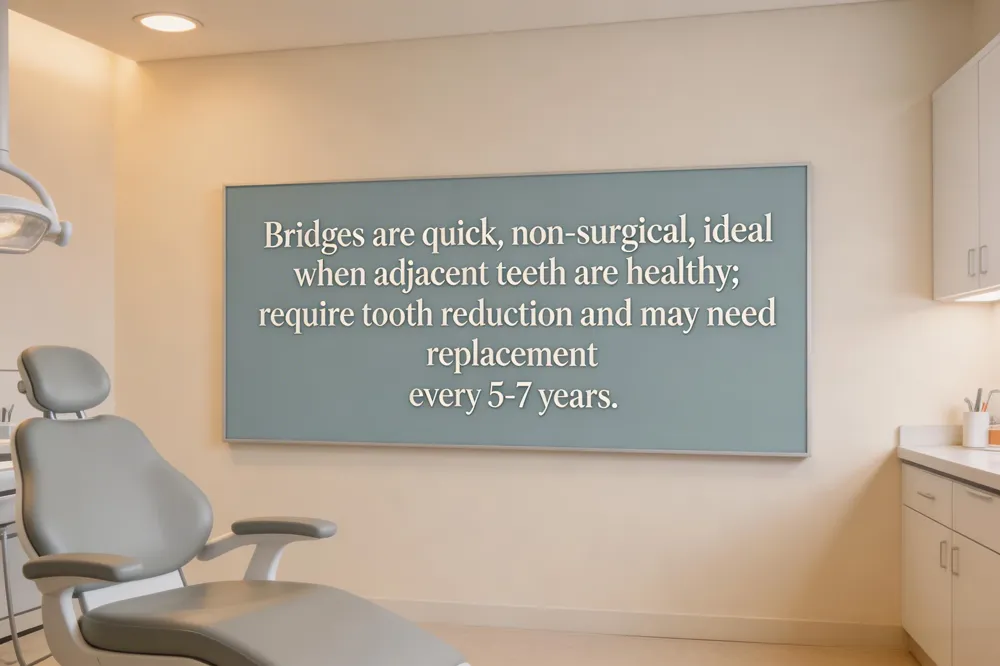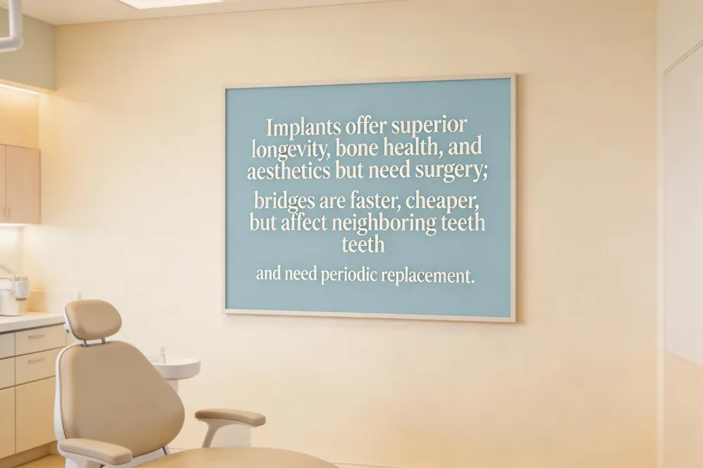 Pros & Cons Summary – Implants provide superior long‑term stability, bone health, and aesthetics but require surgery, a healing period, and higher upfront cost. Bridges are quicker, non‑invasive, and often covered by insurance, yet they involve altering healthy teeth and may need periodic replacement. The best choice depends on your oral health, budget, treatment timeline, and personal preferences; discuss these factors with your dentist to create a personalized plan.