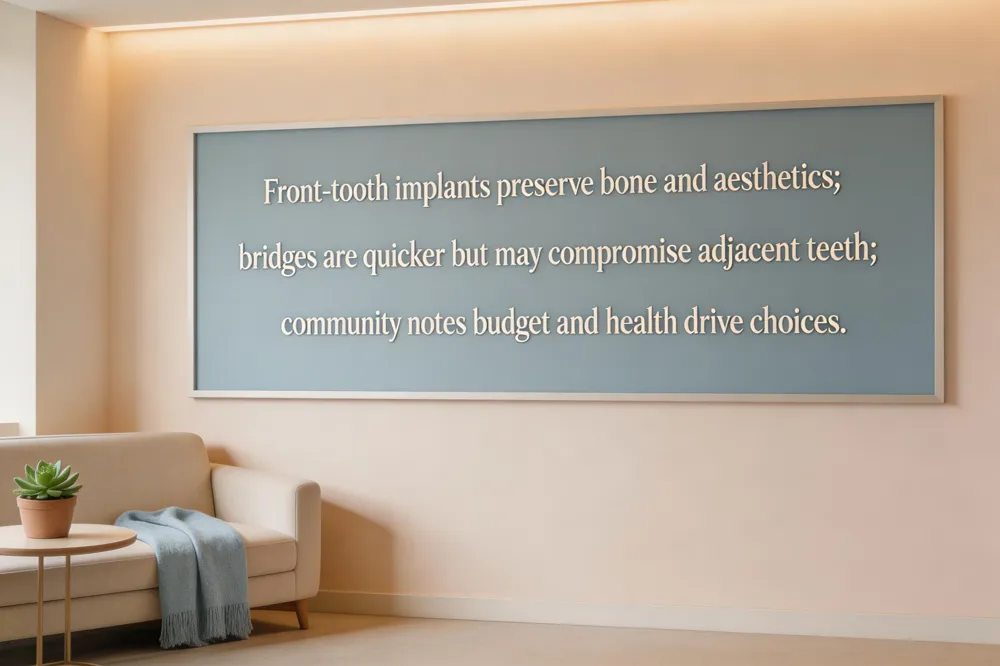 For a missing front tooth, a bridge offers a quick, non‑surgical solution using adjacent teeth as anchors. It requires minimal tooth reduction and can be completed in two visits, but the supporting teeth are shaved down and the restoration may need replacement every 5‑7 years. An implant places a titanium post directly into the jawbone, preserving bone and avoiding alteration of neighboring teeth. Though surgery and a 2‑6 month healing period are required, implants typically provide a more stable, long‑term aesthetic that feels like a natural tooth. If your side teeth are healthy and you need a faster, lower‑cost option, a traditional or Maryland bridge may be suitable; however, for a permanent, bone‑preserving result, an implant is often preferred.
