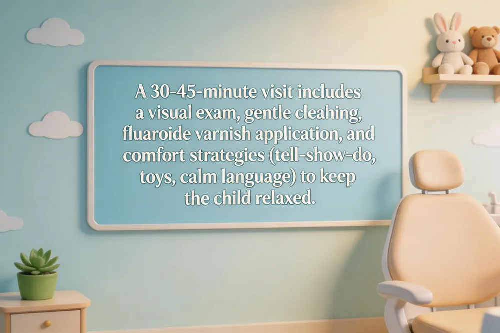 During the first appointment (30‑45 min) the dentist performs a gentle visual exam of the teeth, gums, bite and jaw, often with the child on a parent’s lap. Early decay, injuries or developmental issues are checked, then a soft cleaning is done. When appropriate, fluoride varnish is painted on primary teeth—research shows it cuts cavities by about one‑third. If the first permanent molars are erupting, sealants may be discussed for up‑to‑80 % protection. Comfort is a priority: bright décor, toys, a “tell‑show‑do” approach, and a comfort item help keep the child calm; a morning slot and calm, positive language further reduce anxiety. Small wiggling or tears are normal and the team responds with reassurance. If a child has not been seen by age 3, the AAPD still recommends a visit to establish a dental home, perform the same exam, cleaning and preventive counseling, and address habits such as thumb‑sucking or pacifier use.