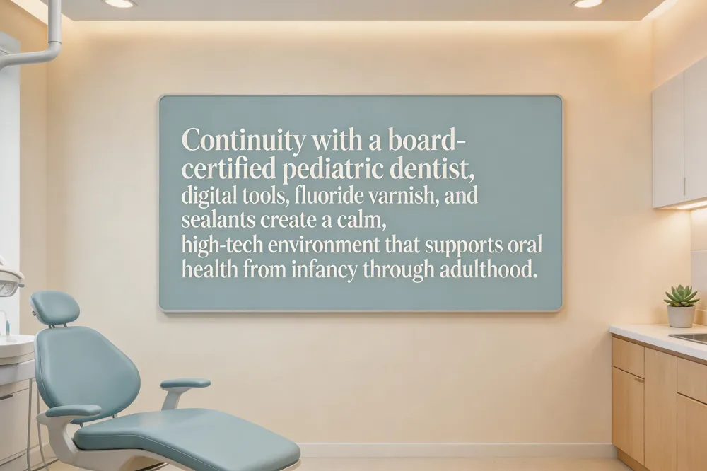 At Veenstra Family Dental we view every child’s first appointment as the foundation of a lasting dental home. By seeing the same board‑certified pediatric dentist over the years, families benefit from continuity of care—each visit builds on the last, allowing the dentist to track growth, anticipate needs, and tailor comfort strategies that keep anxiety low. Prevention is woven into every check‑up: fluoride varnish applied at the first visit can cut cavity risk by about one‑third, while sealants placed on erupting molars protect against up to 80% of decay. Our family‑focused practice uses modern tools—digital intra‑oral cameras, interactive screens, and gentle “tell‑show‑do” techniques—to make exams fun and transparent for children and reassuring for parents. Together, these elements create a welcoming, high‑tech environment that supports healthy smiles from infancy through adulthood.